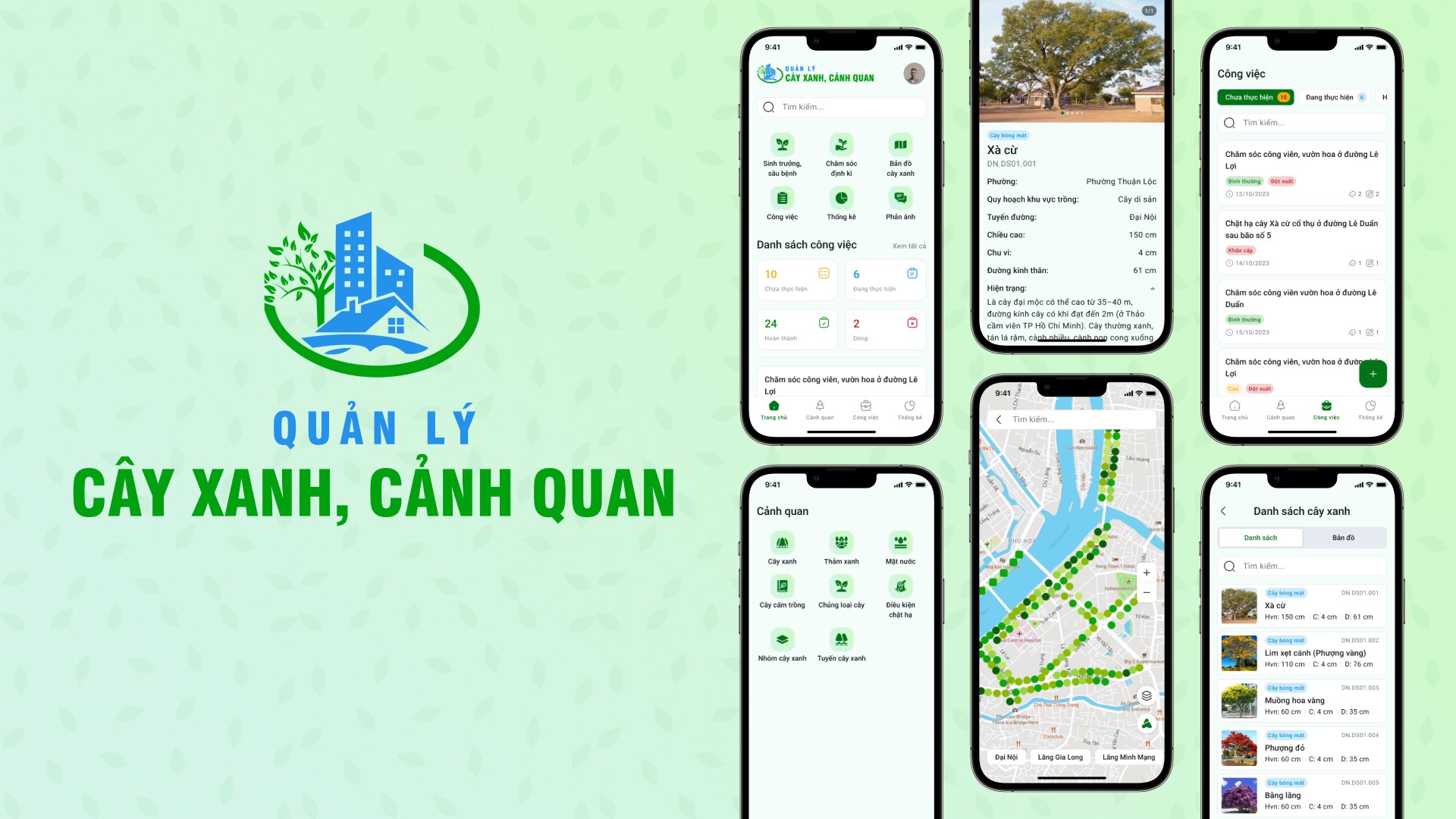 - - Quản lý công việc chăm sóc cây xanh bao gồm lập kế hoạch, nhắc lịch, và theo dõi lịch sử chăm sóc, sâu bệnh, sinh trưởng, di dời, và chặt hạ.