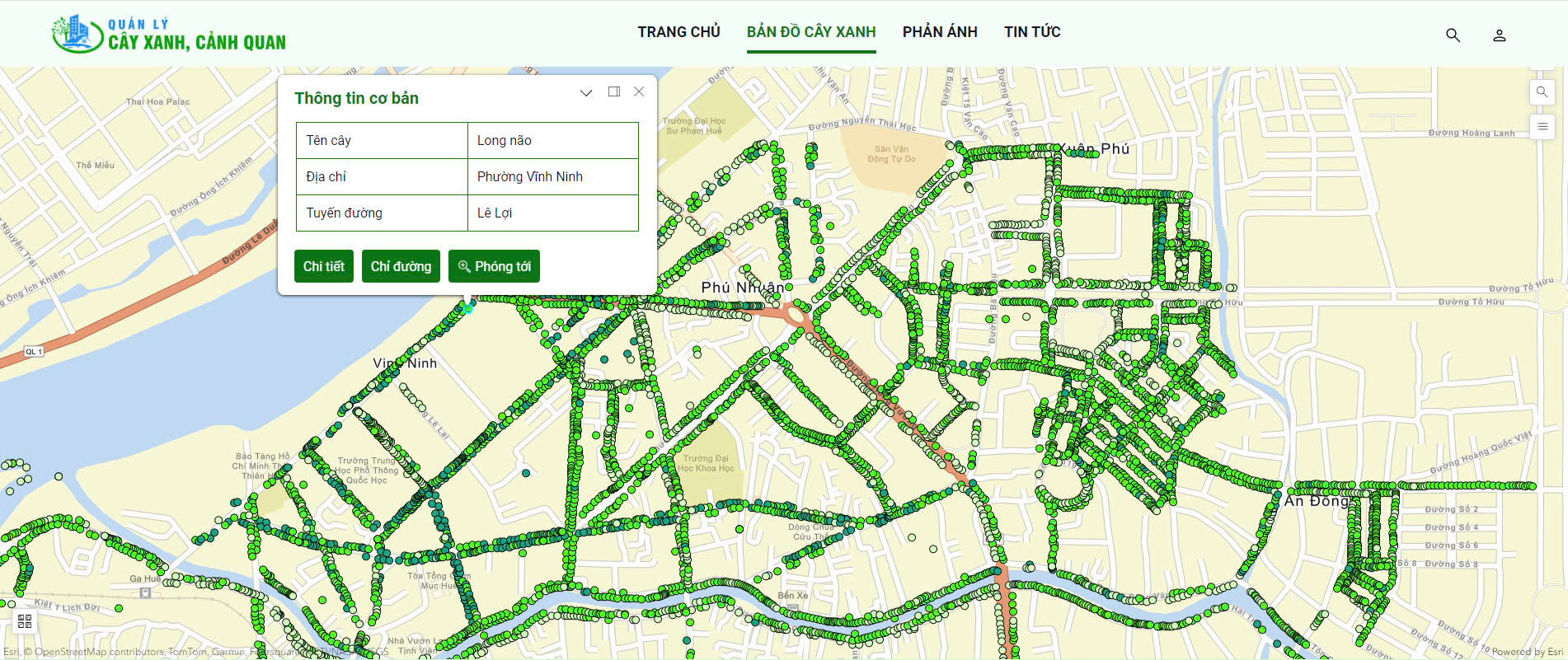 - - Quản lý thông tin và tra cứu cây xanh/tài sản được định danh trên bản đồ, cho phép người dùng tìm kiếm theo thuộc tính, vị trí gần nhất và hiển thị thông tin chi tiết gắn với vị trí địa lý.