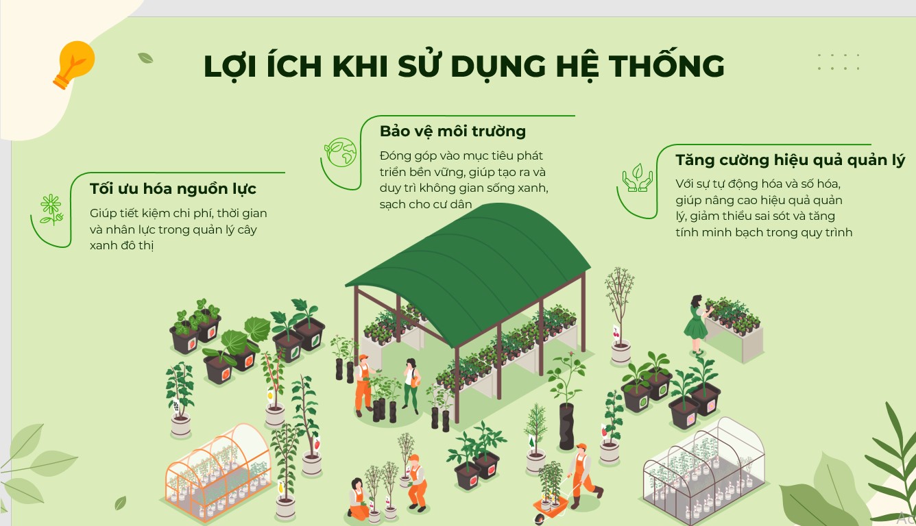 - - Hỗ trợ bảo trì, chăm sóc cây xanh trên nền tảng số, tích hợp các công nghệ tiên tiến như bản đồ số, ảnh vệ tinh, định vị toàn cầu và các thuật toán tối ưu.