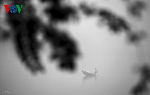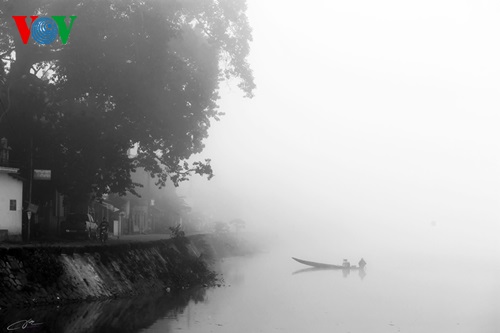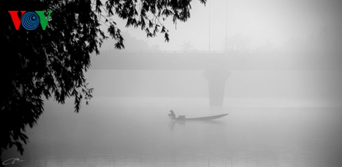Sương giăng kín dốc Bến Ngự, trôi từng vạt trắng trên các tháp chuông nhà thờ. Những khoảng trống trong các vườn cây cũng trắng mờ sương. Và sông Hương lênh loang trong sương trắng mơ màng. Người ta chỉ nhận ra đó là dòng sông Hương khi trong sương mù bất chợt có một bóng thuyền xôn xao mặt nước...
