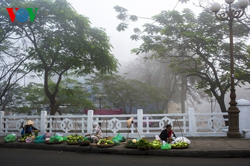 Trong sương, nhịp sống vẫn diễn ra bình lặng.