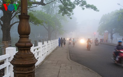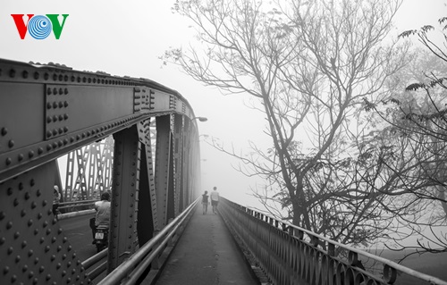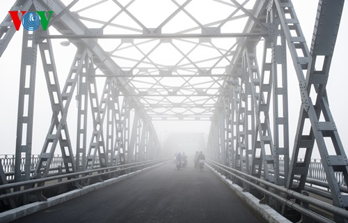 Cầu Tràng Tiền mờ ảo trong sương sớm.
