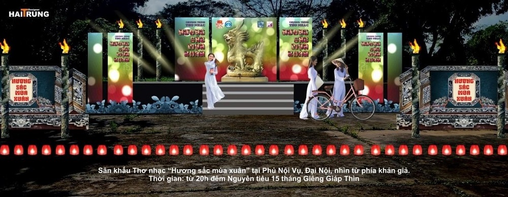 Phối cảnh sân khấu Thơ nhạc "Hương sắc mùa Xuân" tại Phủ Nội Vụ - Đại Nội Huế do Trung tâm Bảo tồn Di tích Cố đô Huế tổ chức vào Đêm Nguyên tiêu sắp tới