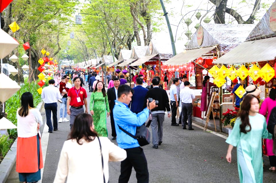 Các đại biểu tham quan các gian hàng Tết Huế sau chương trình khai mạc