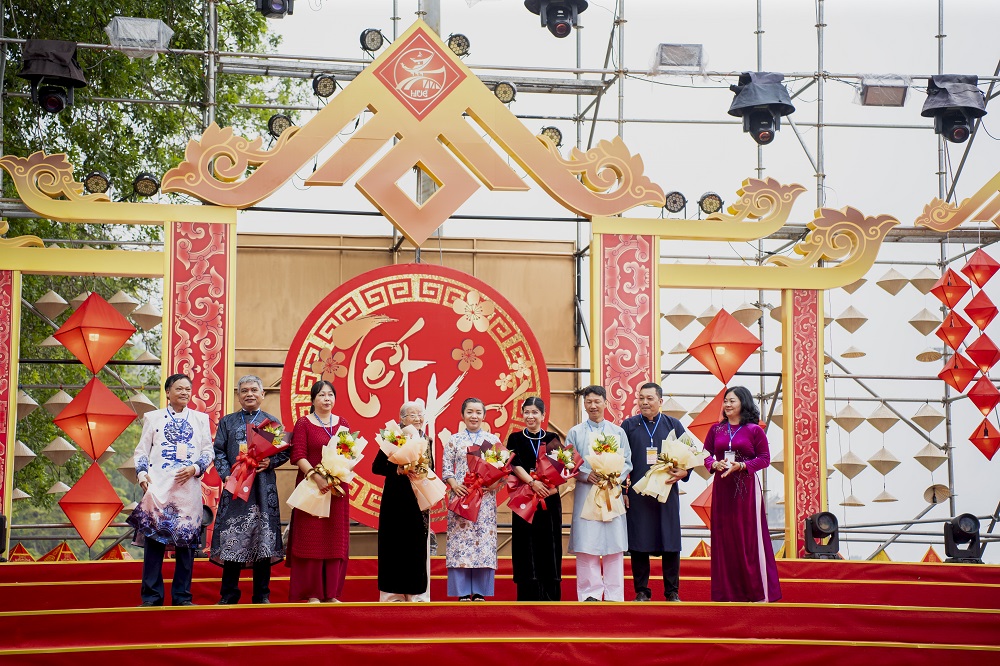 Ban tổ chức chương trình Tết Huế tặng hoa cho các nghệ nhân tham gia đồng hành