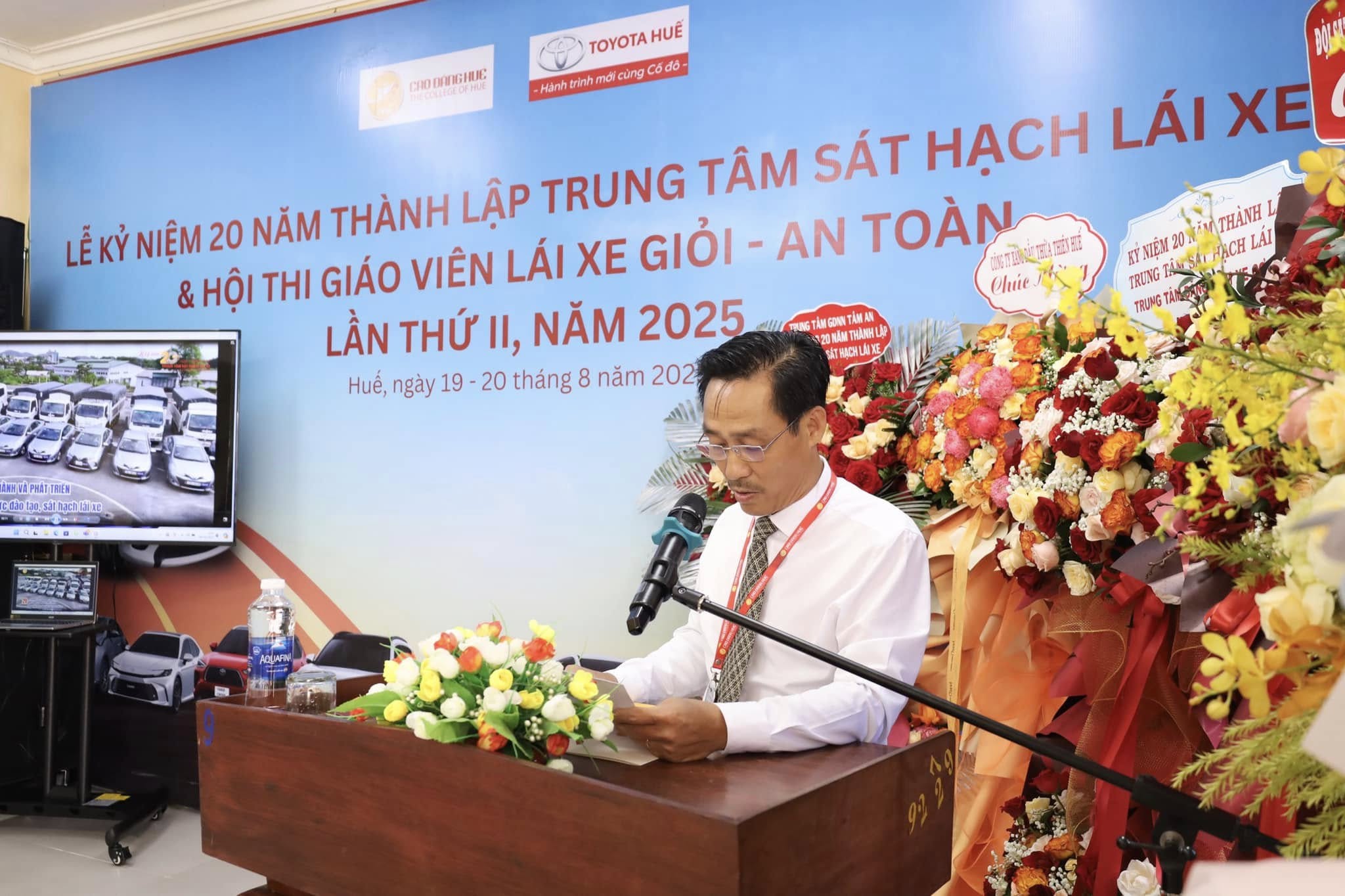 Trong diễn văn tại lễ kỷ niệm, đại diện Trung tâm Sát hạch lái xe - ông Hoàng Tiến Dũng, Giám đốc trung tâm nhấn mạnh: “Hai mươi năm – một chặng đường tuy chưa dài so với lịch sử, nhưng đủ để khẳng định vị thế và vai trò của Trung tâm trong sự nghiệp đào tạo, sát hạch lái xe. Thành tựu đạt được là kết tinh của trí tuệ, công sức và tâm huyết của nhiều thế hệ cán bộ, viên chức, người lao động. Bước sang giai đoạn mới, Trung tâm xác định tiếp tục đổi mới, nâng cao chất lượng dịch vụ, tăng cường cơ sở vật chất, đẩy mạnh ứng dụng công nghệ và mở rộng hợp tác, góp phần quan trọng vào sự nghiệp xây dựng Trường Cao đẳng Huế trở thành trường cao đẳng hàng đầu, đáp ứng tốt hơn nữa yêu cầu phát triển kinh tế – xã hội và đảm bảo trật tự, an toàn giao thông.”