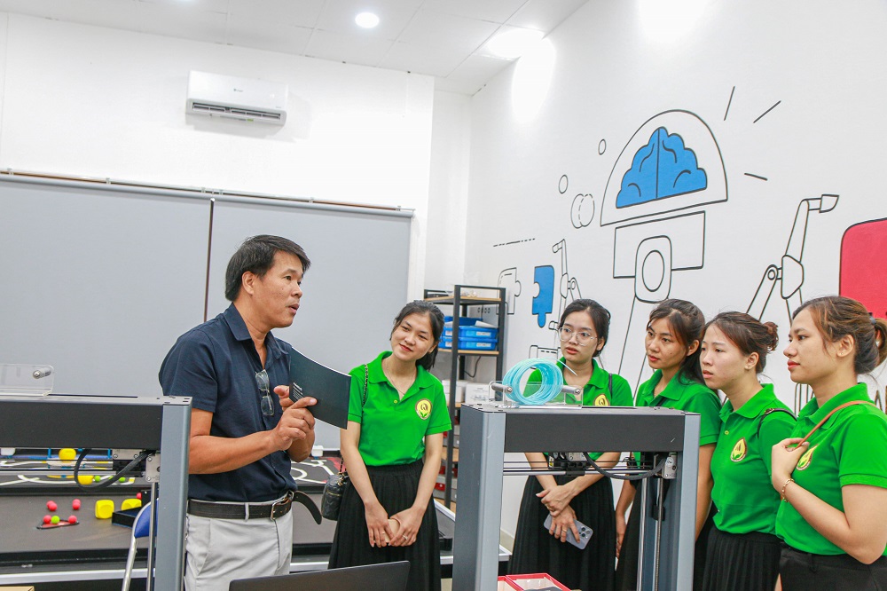 Các giáo viên Trường Thực hành Mầm non (Trường Cao đẳng Huế) tìm hiểu về công nghệ in khắc lazer tại phòng STEAM
