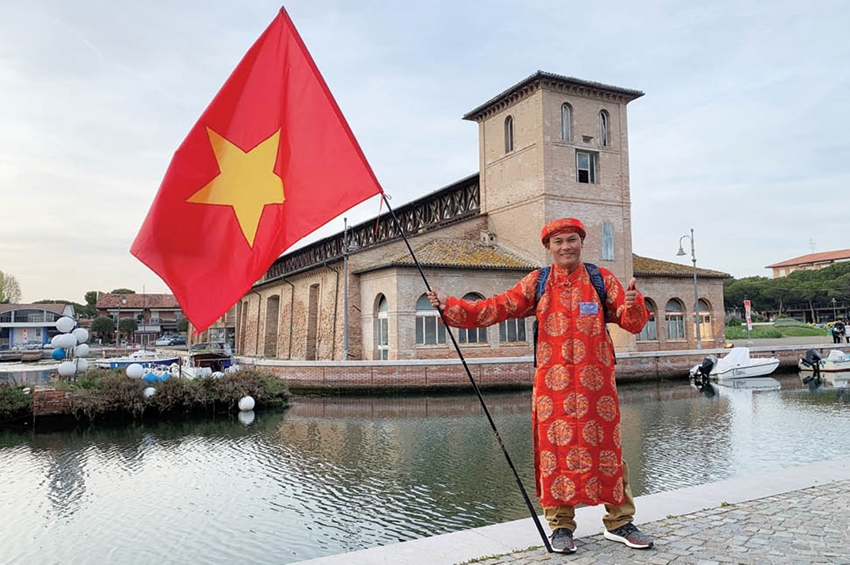 Nghệ nhân ưu tú Nguyễn Đăng Hoàng trong trang phục áo dài truyền thống, bên lá cờ Tổ quốc trong một dịp đi tham dự lễ hội diều ở nước Ý. Ảnh: Nhân vật cung cấp