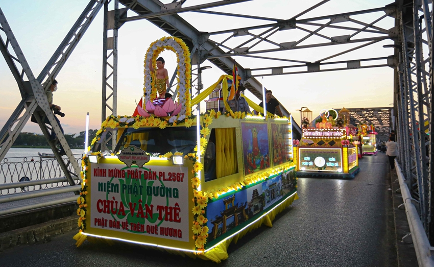 Đoàn xe hoa rước Phật di chuyển qua cầu Trường Tiền