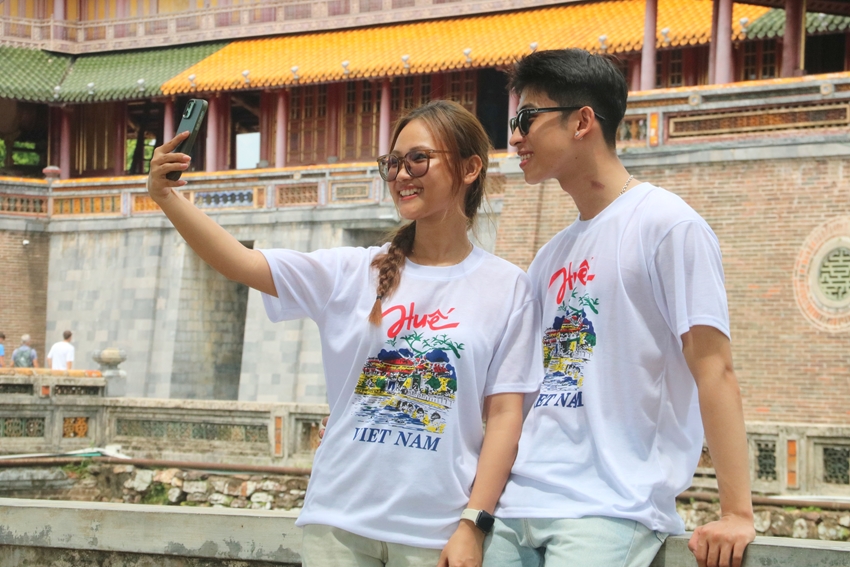 Đôi bạn trẻ ngoại tỉnh mặc áo lưu niệm Huế để ghi lại những khoảnh khắc khi đi du lịch Cố đô