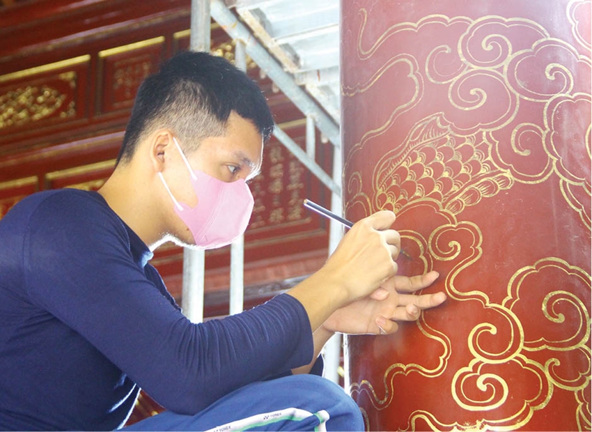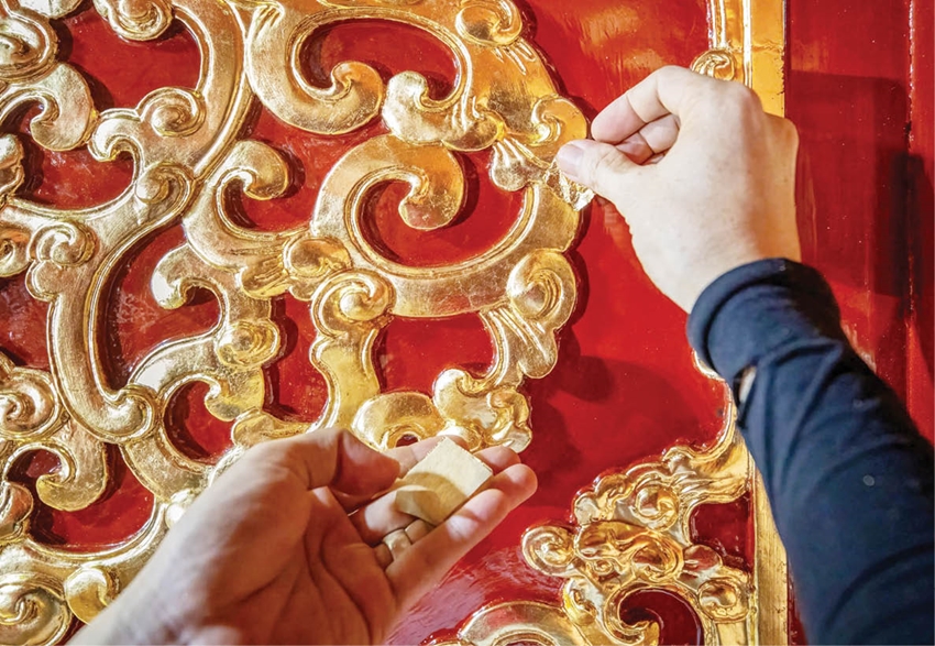 Thếp vàng cho các hoa văn. Ảnh: Nguyễn Phong