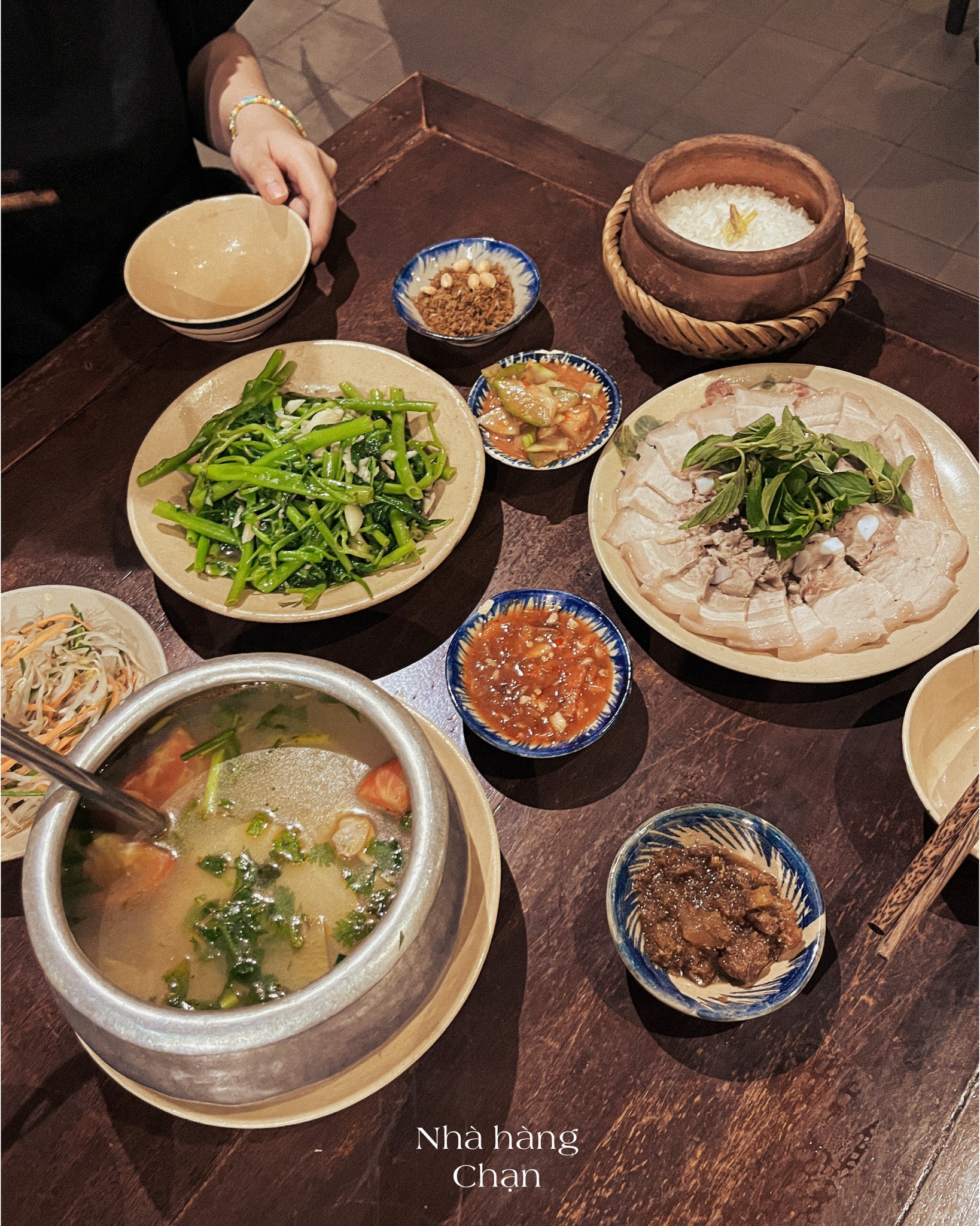 Cơm nhà chuẩn vị Huế (Authentic Hue-style Home-cooked Rice): Chạn Rice Restaurant - 1 Nguyễn Thái Học. We ordered boiled meat with sour shrimp sauce, sour soup, stir-fried vegetables, along with rice - it cost only 300,000 VND for 2 people and was incredibly filling.
