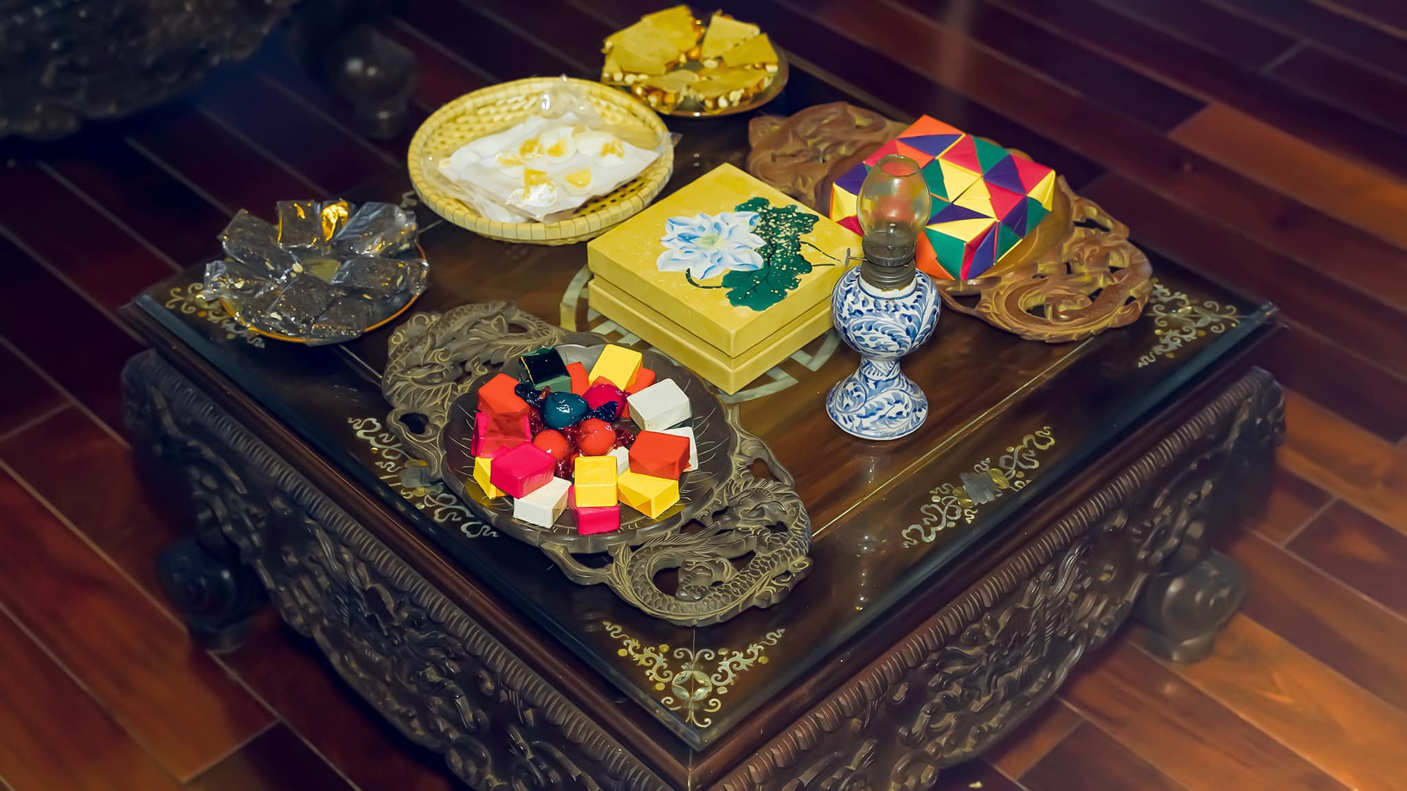 Tet also carries the scent of molded cakes. In the past, Mom made various types of cakes wrapped in shiny colored paper. The scent of fragrant pomelo, vanilla, and the aroma of flour filled the air. All are placed in precious wooden trays adorned with mother-of-pearl inlay. It's also the scent of green bean sweet soup, and purple sweet potato sweet soup, served in delicate porcelain bowls painted with green dragon patterns, arranged in rows on the table. And the scent of square glutinous rice cakes simmering in boiling water on New Year's Eve, carrying the fragrance of cooked glutinous rice, matured banana leaves, and another indescribable yet unforgettable aroma.