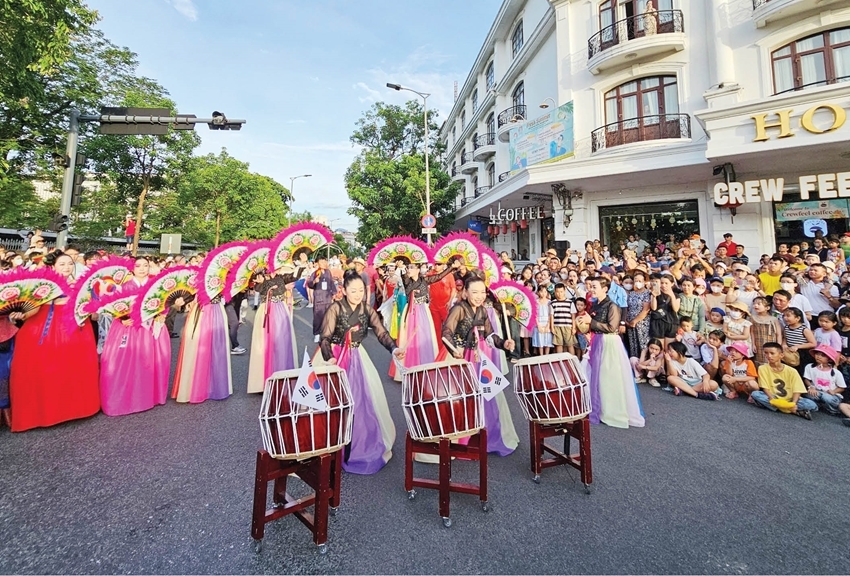 There, viewers were immersed in the beautiful dances of the artists from Yangpyeong Art Troupe (Korea). On the background of roaring drums, the artists from the land of kimchi in colorful costumes move smoothly and skillfully. With tireless steps, the artists try to display all the quintessence of art with the hope of bringing laughter to visitors. Every place this troupe stops to perform always attracts viewers and continuous applause.