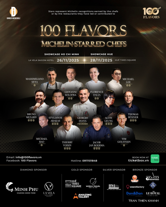Within the framework of the National Tourism Year 2025, “100 Flavors – Michelin-Starred Chefs” event will take place from November 23 to November 30, 2025 in Hue City and Ho Chi Minh City. The event is believed to bring international culinary essences to harmonize with Vietnamese culinary heritage, position Vietnam as a leading Asian destination for both gastronomy and tourism.