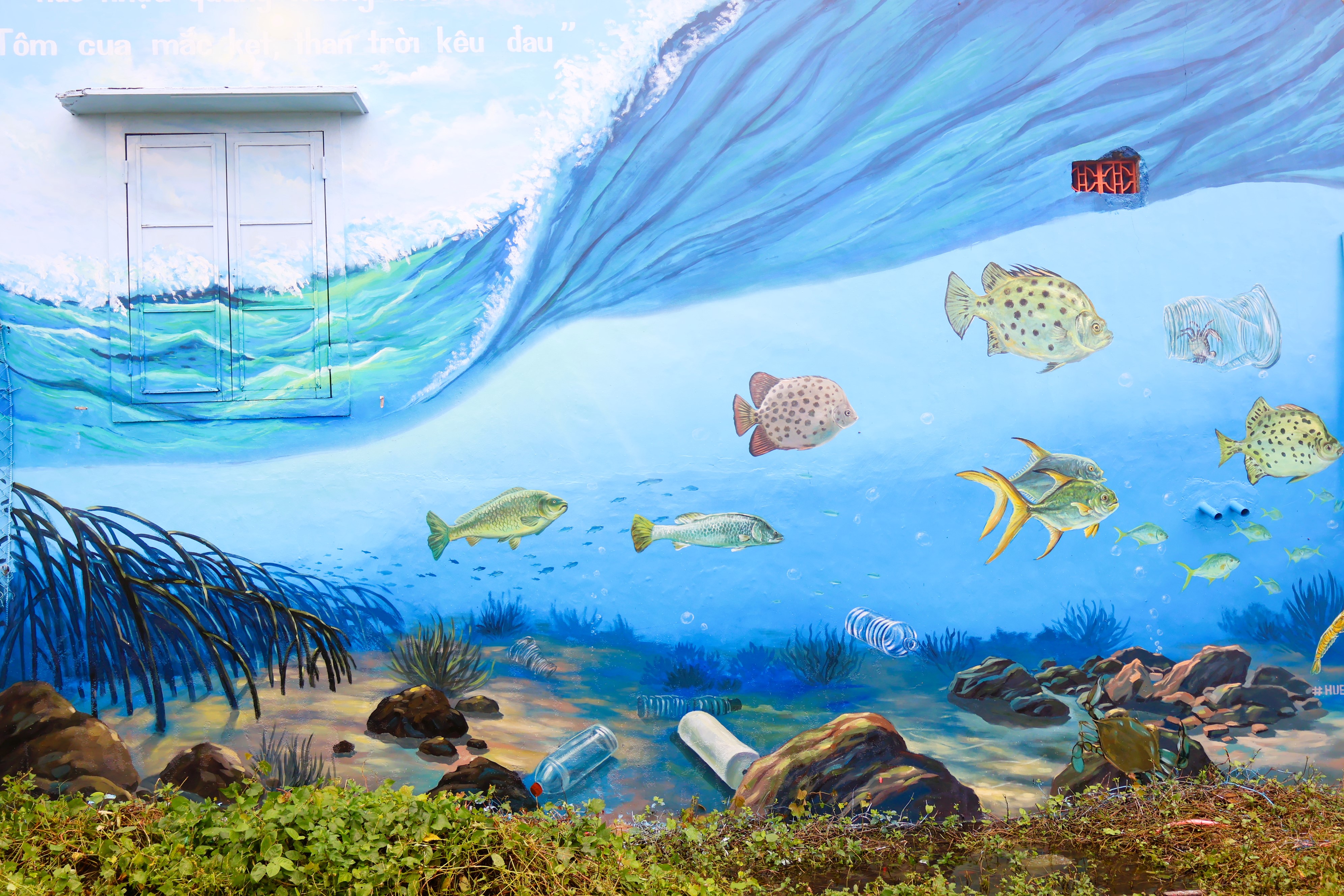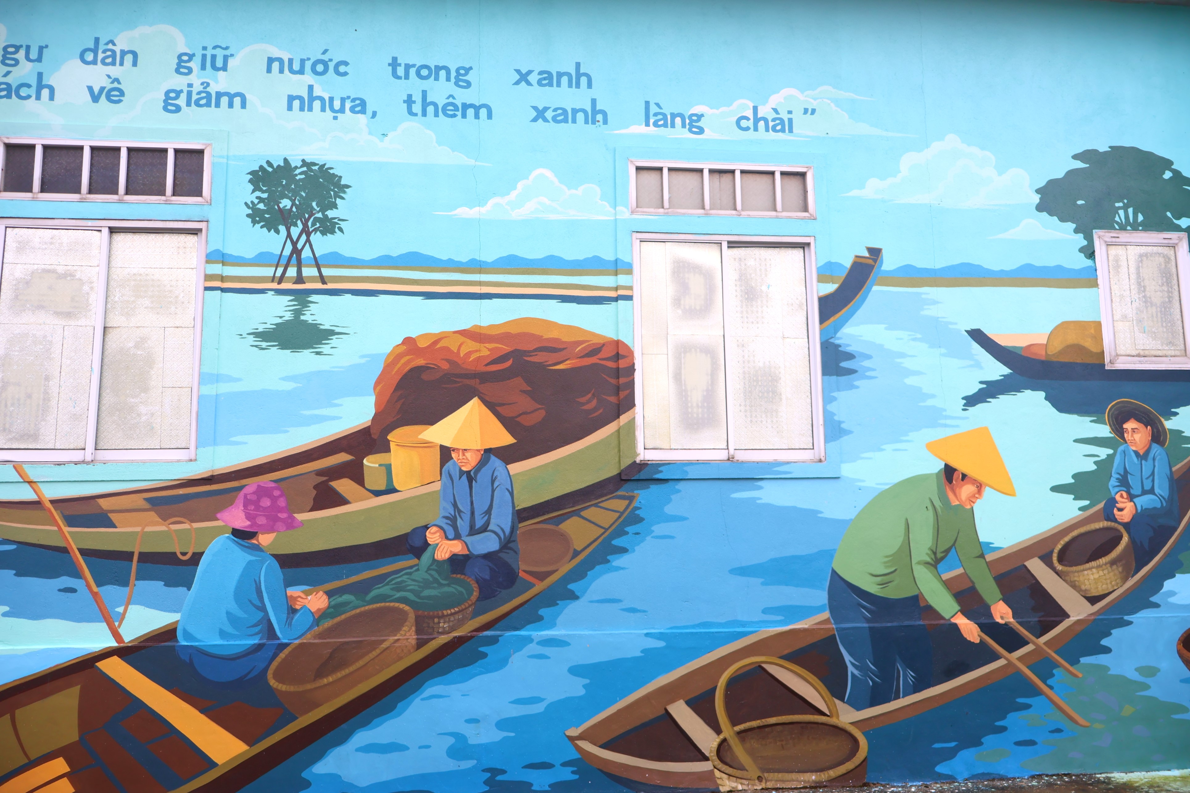 Colorful murals painted by artists on the walls of homes in Ngư Mỹ Thạnh - Cồn Tộc village, conveying messages of green living and collective efforts to build a sustainable plastic reduction tourism destination.