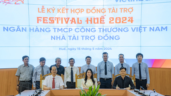 Trong không khí khẩn trương chuẩn bị trước thềm Tuần lễ Festival nghệ thuật Quốc tế Huế 2024 (07 - 12/6/2024), chiều ngày 15/5, tại hội trường UBND tỉnh Thừa Thiên Huế, BTC Festival Huế tổ chức Lễ ký kết hợp đồng tài trợ với danh vị “Tài trợ Đồng” cùng 3 đơn vị: Ngân hàng TMCP Đầu tư và Phát triển Việt Nam (BIDV), Ngân hàng TMCP Công Thương Việt Nam (VietinBank) và Tập đoàn BRG.
