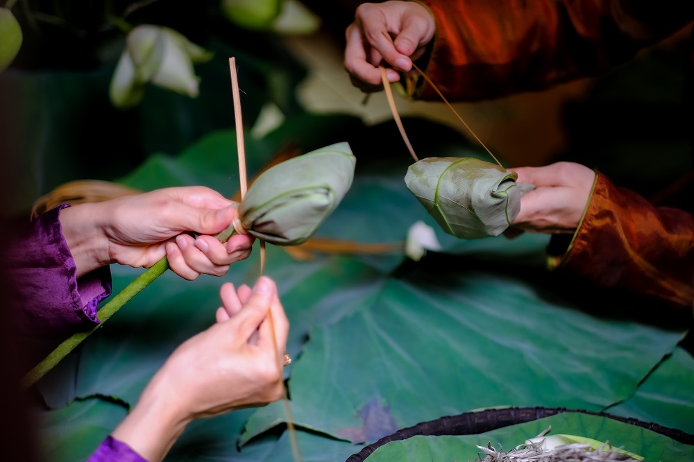 The process of wrapping lotus flowers with lotus leaves inside at Nhi Do Mai Tea