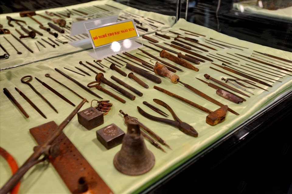 The space of Tinh Tam Kim Co can be considered a "miniature museum" of jewelry in Hue. Owners arranged many precious and valuable artifacts such as copies of the ordinance of the Nguyen emperor for Hue jewelry; Ancient tools used to make jewelry such as hammers, pliers, tongs, sticks, files, molds, whistles, blow tanks... The crafting space, the workplace of the craftsman is also arranged, the layout is a bit ancient, making visitors feel the environment and atmosphere of the ancient jeweler.