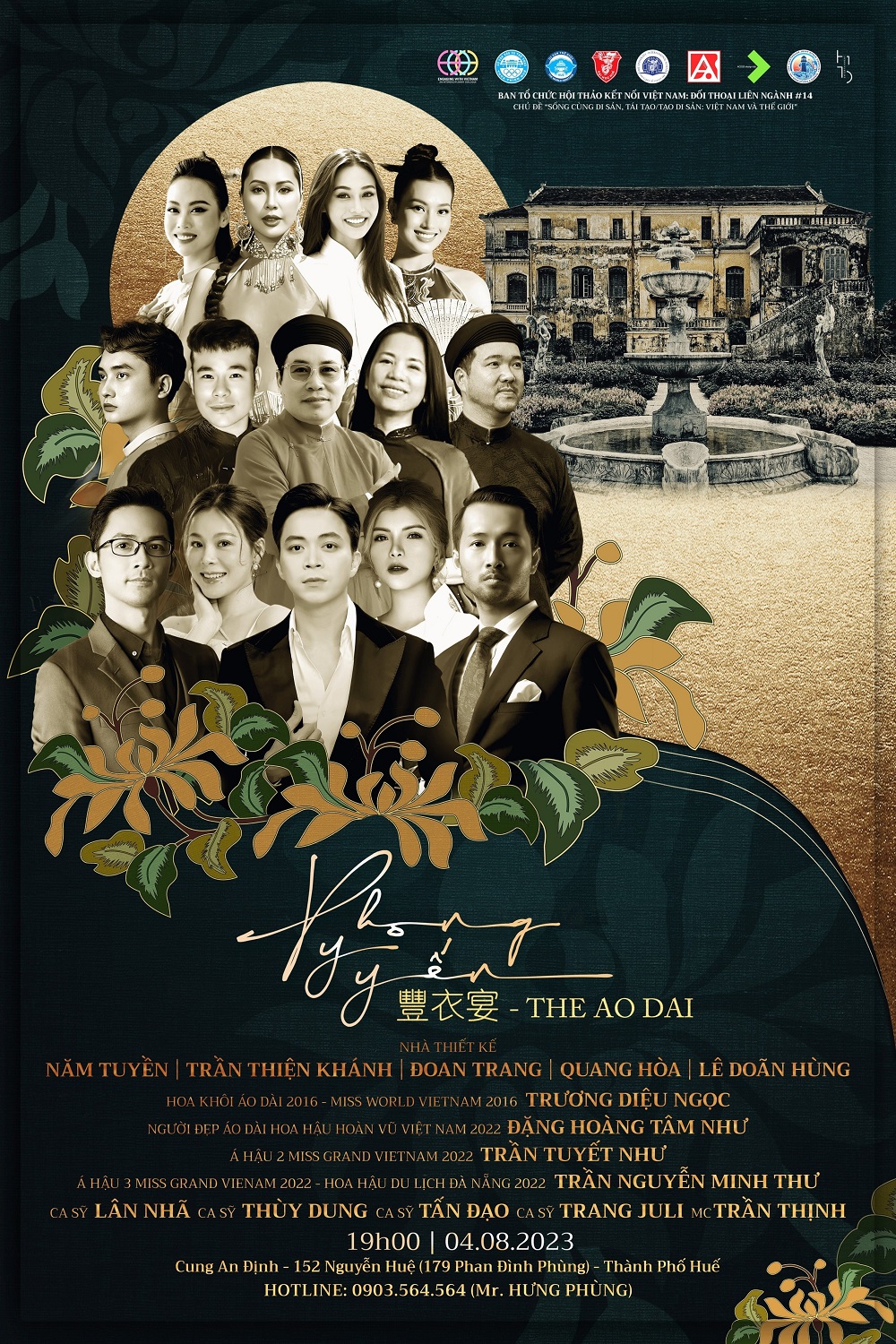 Held at 19:00 on August 4, 2023, at An Dinh Palace (152 Nguyen Hue, Phu Nhuan Ward, Hue City), Phong Y Yen Ao Dai was created with the implication of just one night of gatherings. The landscape is prosperous and prosperous, reflected in colorful costumes, brilliant colors, and adorns the beauty of Hue - Kinh Do ancient brocade flowers. Visitors to the festival will enjoy a lot of Ao Dai works from enthusiastic designers such as Designer Pham Van Tuyen (Ao Dai Nam Tuyen); Designer Tran Thien Khanh with Kim Minh Thien Hac Collection (using the image of cranes as the main theme to portray the pure and noble beauty of Vietnamese women through the ao dai); Designer Nguyen Thi Doan Trang (one of three representatives of Vietnam invited to participate in the exhibition introducing the beauty of national culture in Korea); Designer Tran Hong Quang Hoa with the Connectivity Collection (traditional five-body long dress on youthful Jean material combined with personality style from hand-woven patterns of ethnic minorities in the Northwest); Designer Le Doan Hung with Ha Y Collection (ao dai collection is inspired by the beauty of the sky at sunset)...