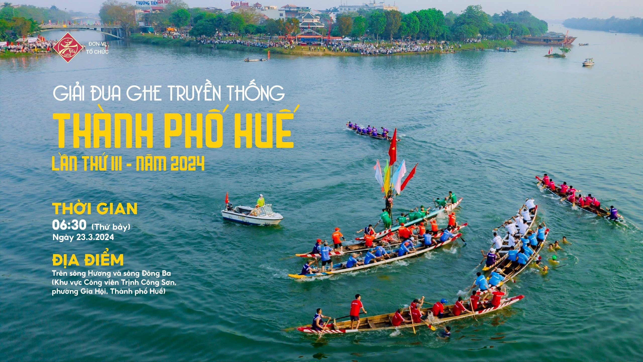 Vừa qua, UBND thành phố Huế thông tin, Giải đua ghe truyền thống thành phố Huế lần thứ III- năm 2024 sẽ được tổ chức vào ngày 23/3/2024. Hoạt động nhằm chào mừng kỷ niệm 93 năm Ngày thành lập Đoàn TNCS Hồ Chí Minh (26/3/1931- 26/3/2024), 78 năm Ngày truyền thống ngành Thể thao Việt Nam (27/3/1946 - 27/3/2024), 49 năm Ngày Giải phóng Thừa Thiên Huế (26/3/1975 - 26/3/2024), hướng đến chào mừng Festival Huế 2024.