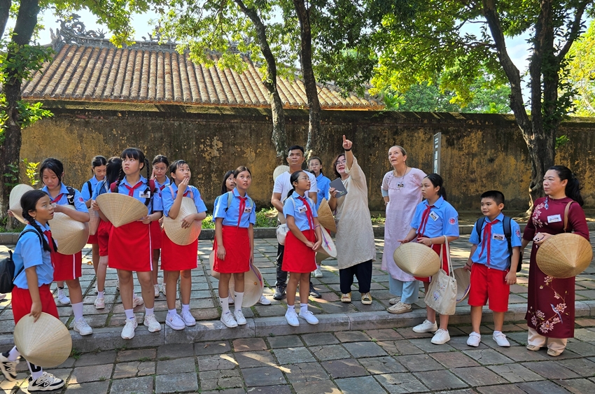 Học sinh nghe giới thiệu về di tích điện Phụng Tiên - Đại Nội Huế