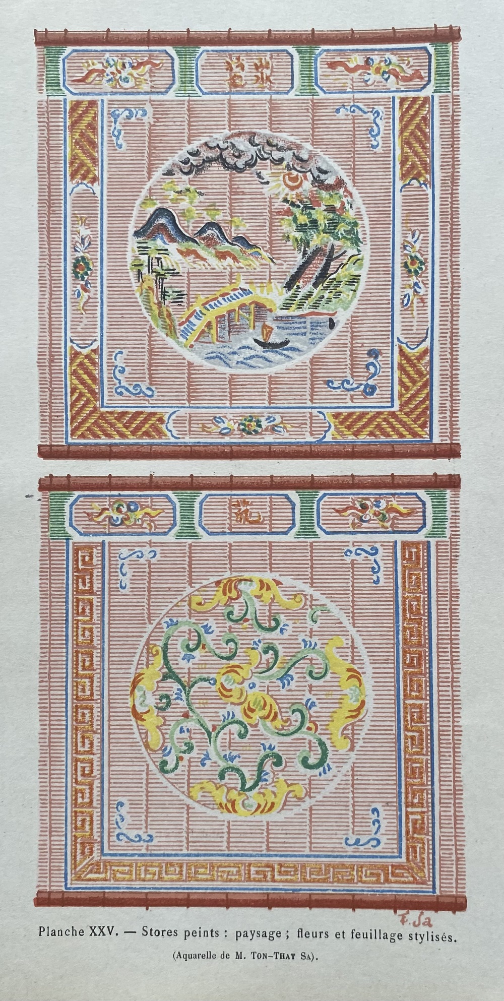 Mành có trang trí hình phong cảnh, hoa và cành lá cách điệu. Tranh màu nước của Tôn Thất Sa.